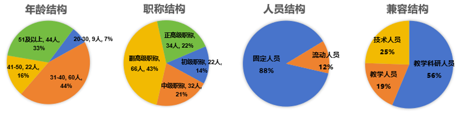 示范中心现有人员队伍共计154人,其中固定人员共计135人,流动人员19人。其中,具有正高级职称人员34人(占总人数22.1%),副高级职称人员66人(占总人数42.9%);具有博士学位96人(占总人数62.3%),硕士学位19人(占总人数12.3%)。示范中心现有全国模范教师1人,国家高层次领军人才3人,国家高层器青年人才3人,973首席科学家3人,教育部新世纪优秀人才6名,国家优秀青年科学基金1人、教育部创新团队带头人1人、北京市高等学校教学名师4人。