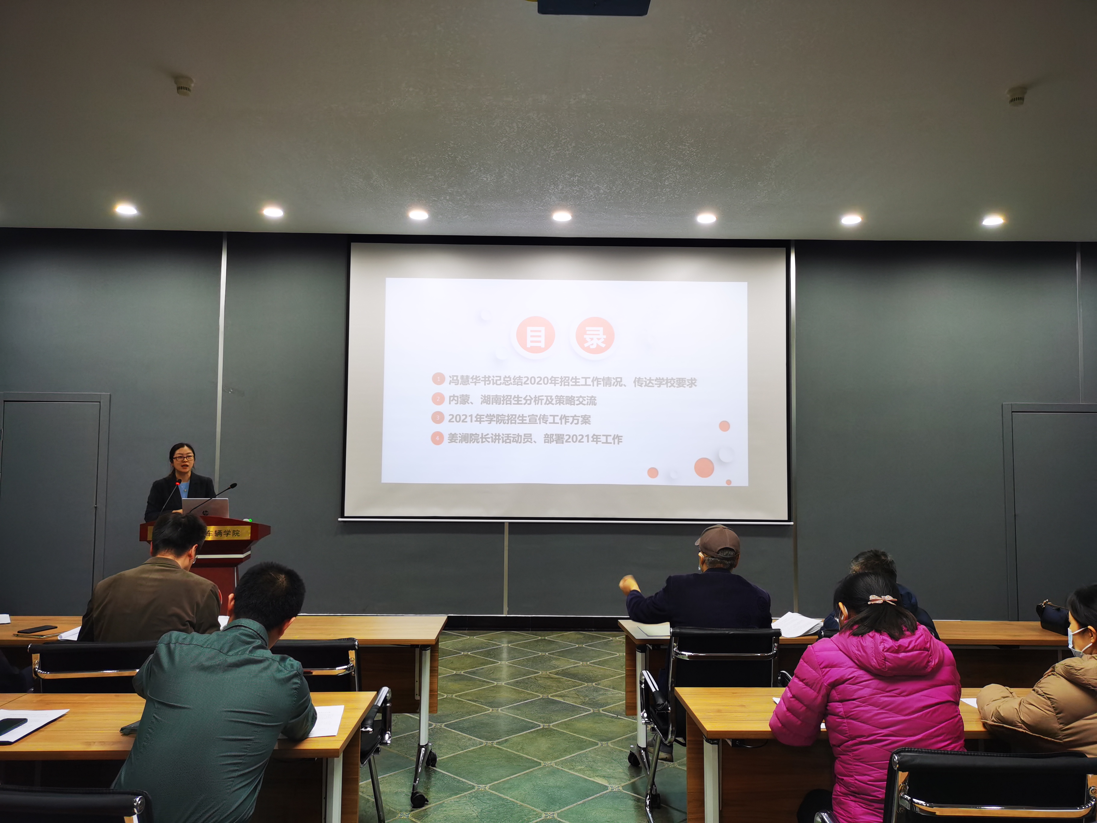 3月10日下午,色情导航 召开2021年本科招生宣传工作动员部署会。学校招生办公室沈宏梁、学院院长姜澜,党委书记冯慧华,副院长何洪文,内蒙、湖南招生组执行组长陈慧岩、王文中、张付军、李向荣、胡耀光、院长助理左哲以及全体领航人参加了会议。会议由学院党委副书记、副院长孙硕主持。