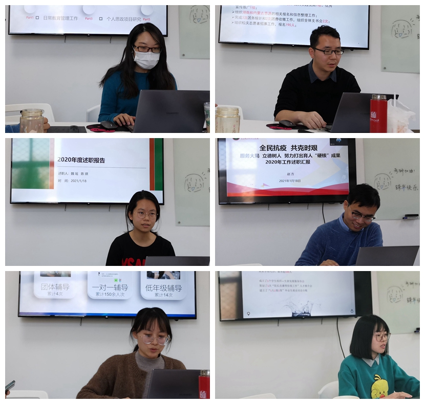 接下来各位辅导员依次进行述职。郝佳馨介绍了2020年主要工作、团学主题教育活动特色、学院团学工作体系,并提出了下一步工作从机械星体系的4个方面以质取胜;周雪从就业工作、校友工作和招生工作三个方面介绍了2020年工作业绩和难点,提出下一步要明晰就业考核指标,主动提前谋划;刘洋从日常教育管理、评奖评优、学生问题活动、心理健康教育和个人思政项目研究五个方面进行各类介绍,提出下一步要加强学风建设,丰富文体活动,关爱心理健康,落实事务工作;赵方以“服务大局,立德树人,努力打出“育人”硬核成果”为题介绍了科创育人、理论育人和服务育人的成果与不足,并提出“抓党建、强修养、促创新、争先锋”的育人计划;邹晓航从就业动员、就业指导和就业服务三个方面介绍了工作成果与不足,针对可能面临的挑战提出尽早动员、全面跟踪、打好线上线下组合拳的计划;魏瑶从理论学习、支部建制、规定动作和网络宣传四个方面进行了工作梳理,并提出下一步要深入挖掘支部特色,加强党建思政宣传。其他兼职辅导员分别针对奖励资助、本科生教育管理、科技创新、新媒体建设等工作进行了述职。