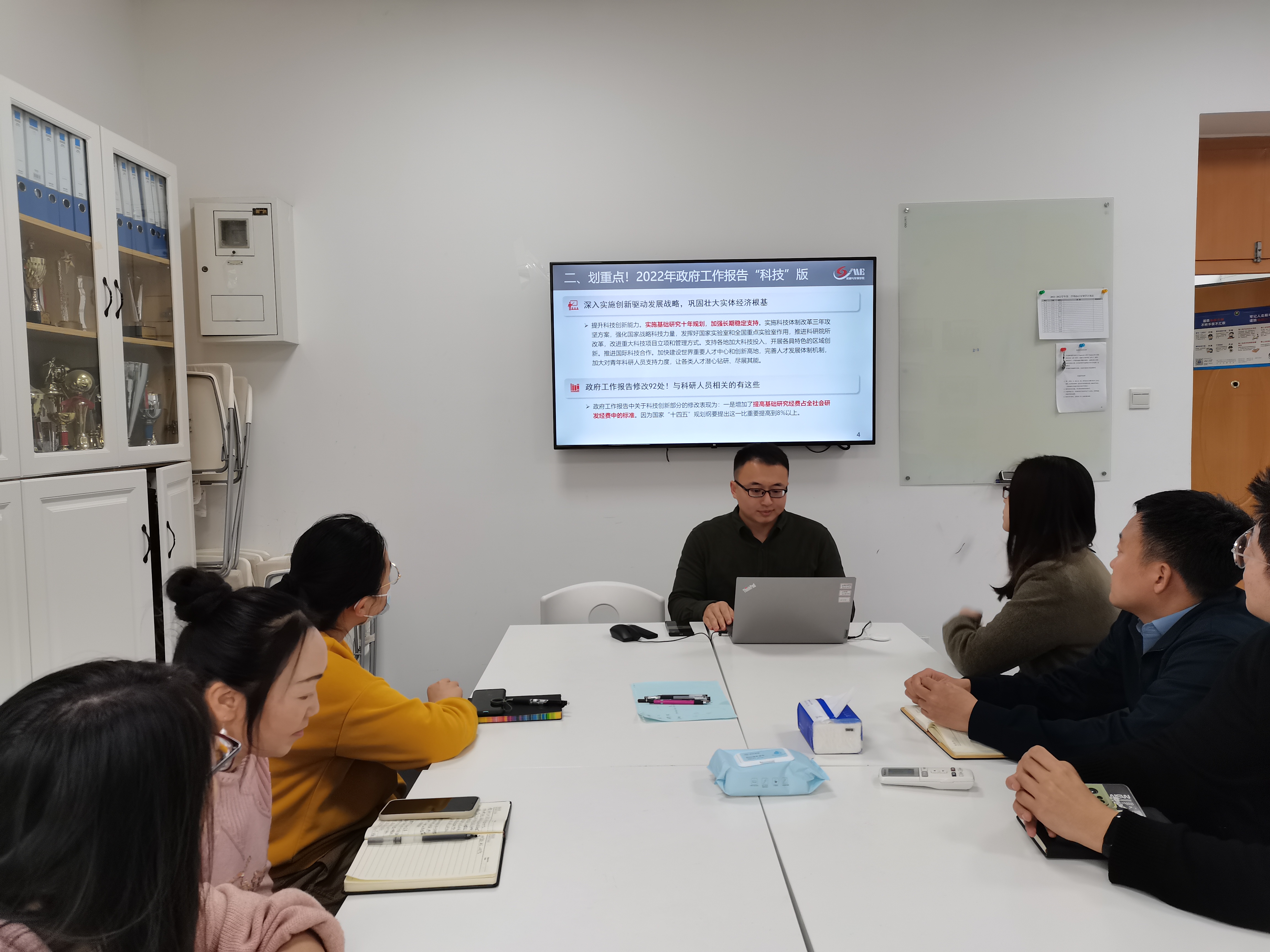 会上,学院兼职辅导员鲁涛结合2022年全国两会的热点以《基础研究是科技创新的源头》为主题进行了领学。参会人员一同学习研究了基础研究的重要意义,并对今年《政府工作报告》中有关基础研究十年规划的有关内容进行充分讨论。最后鲁涛从自身工作的角度分享了教育研究文章《新媒体爆款产品标题的主要类型与风格特征》《融媒时代高校打造新闻宣传“先锋"的思考》,为大家的工作带来了启示。