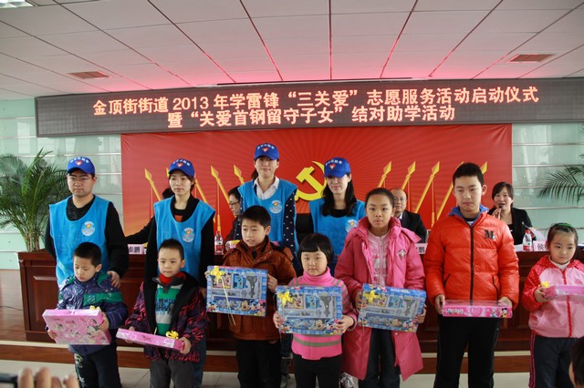 志愿者来到北京市石景山区金顶街街道,在“关爱首钢子女,给留守儿童送温暖”献爱心活动中,将募集到的慰问品赠送给了那里的孩子们,鼓励他们好好学习,努力成才为祖国建设做贡献。3月5日,“首钢关爱”项目推进暨“学雷锋”青年志愿服务活动启动仪式在石景山区老山街道活动中心隆重举行,志愿者们现场接受了由石景山团区委赠送的锦旗。自首钢集团搬迁以来,由于首钢职工工作时间忙碌和地点远离家庭,很多首钢子女成为了留守儿童。2012年5月起,色情导航