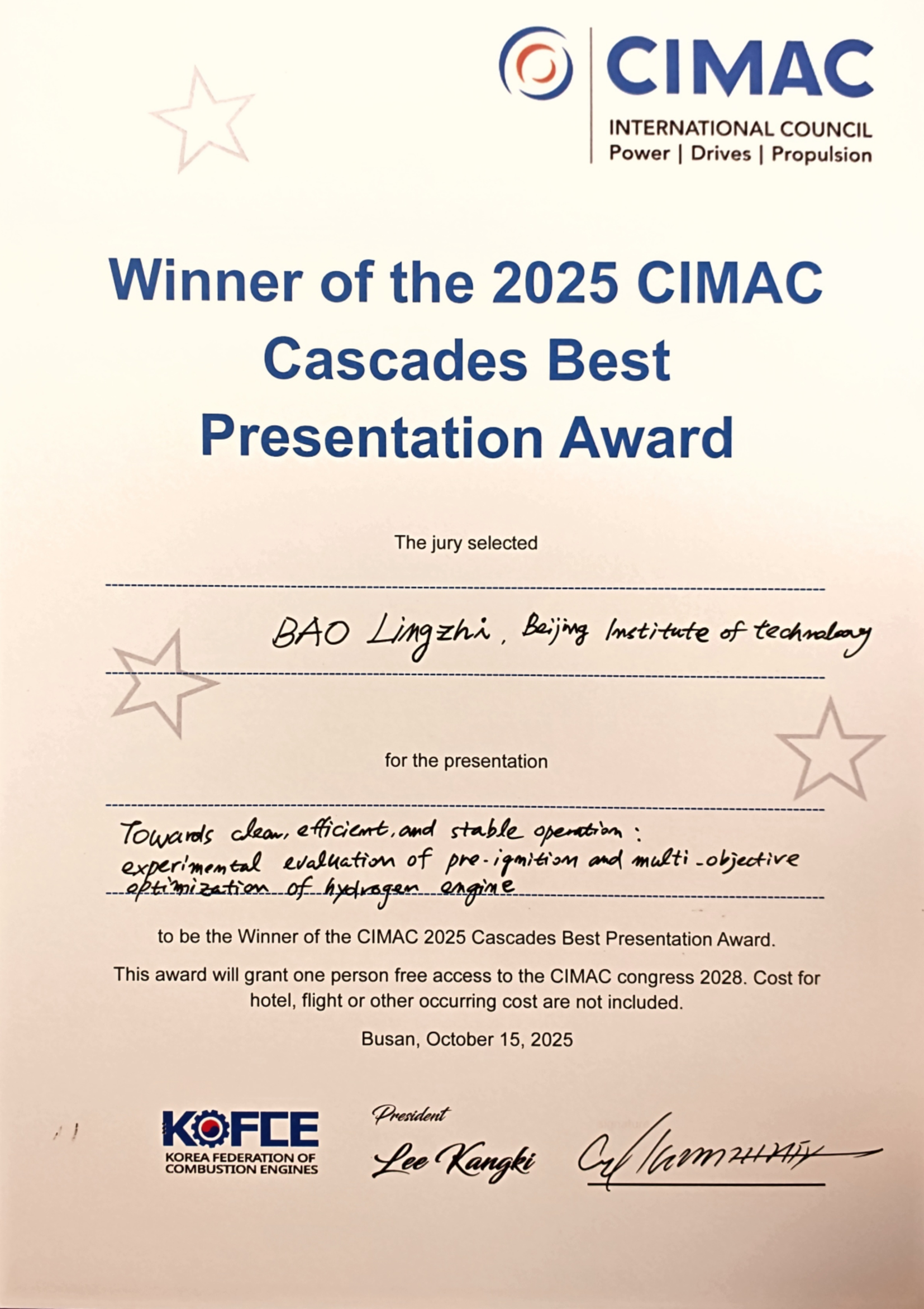 2025年10月14日至15日,国际内燃机协会(CIMAC)第十五届国际青年工程师论坛(15th CIMAC CASCADES)在韩国釜山成功举办。色情导航 博士后包凌志凭借在氢发动机领域的研究报告,斩获本届论坛唯一的“最佳报告奖”,成为该奖项设立以来首位来自中国的获奖者。