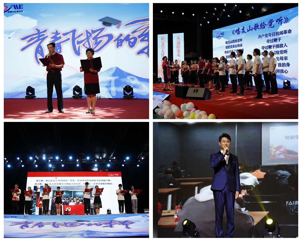 各支部党员代表共同带来的朗诵《青春的河》,在同志们饱含深情的诉说中缓缓淌过你我脚畔;初心不忘青春志,热血共筑中国梦,歌曲《不忘初心》表达了三院学子传承红色基因,永远跟党走的坚定信念;在学院党委书记冯慧华和薛庆老师情深意切的朗诵过后,由机械学院老师们组成的“魅力机车合唱团”,在校学生交响乐团合唱团艺术总监贺春华老师的指挥下,共同演唱《唱支山歌给党听》,用歌声传递了教师们对党的忠诚与热爱,和对伟大的中国共产党100周年华诞的真挚祝福;老师们又以一曲《再见》,将对学生们的送别娓娓道来,为即将远航的毕业生们送出最真诚的祝福。