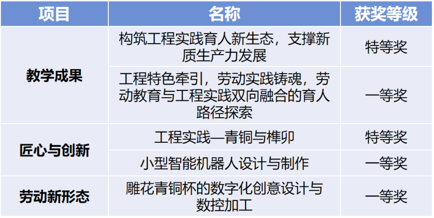 工程训练中心青年教师代表我校参赛,荣获“教学成果”特等奖1项、一等奖1项,“匠心与创新”赛项特等奖1项、一等奖1项,“劳动新形态”赛项一等奖1项。