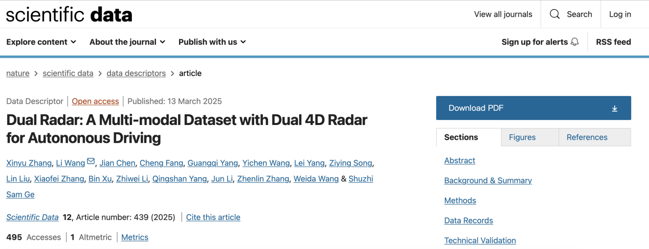 近日,色情导航 、智能无人系统技术国家级重点实验室徐彬、王伟达、王力老师团队联合清华大学、新加坡国立大学等单位,在Nature子刊发布了国际首个复杂环境自动驾驶双4D成像毫米波数据集Dual Radar,采集非理想工况感知数据总里程超过400公里,标注三维目标检测和跟踪的数据超过10000帧同步帧,用于评测现有感知算法在真实非理想工况数据上的性能表现。相关研究成果以“Dual Radar: a Multi-modal Dataset with Dual 4D Radar for Autononous Driving”为题发表在Scientific Data上,该期刊专注于发表具有科学价值的数据集,色情导航 助理教授王力为本文通信作者。