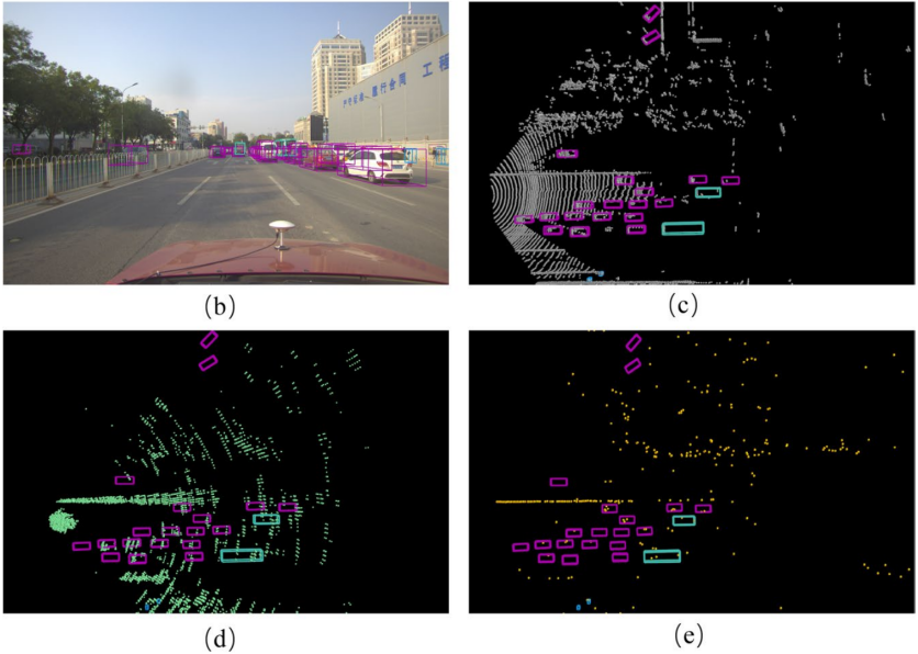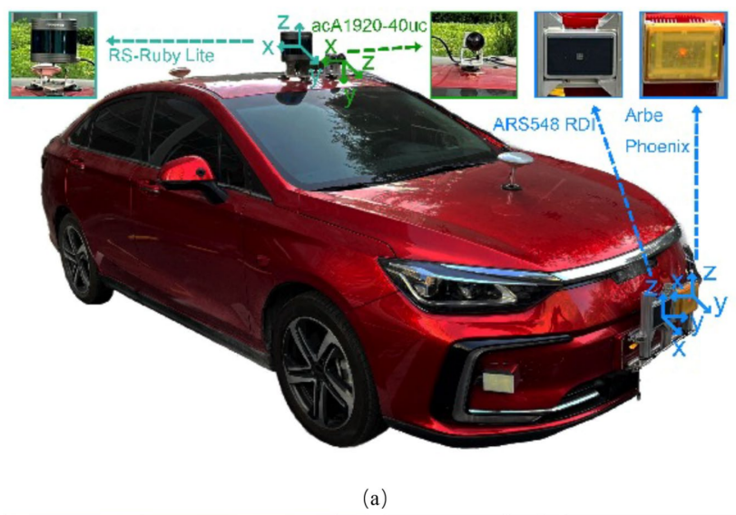 图1 Dual Radar数据采集车及各数据目标检测标注情况(分别为图像、激光雷达点云、Arbe Phoenix点云和ARS548 RDI点云)