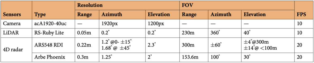 Dual Radar数据集的采集车辆如图1所示,包含了四种传感器,分别为高分辨率相机、激光雷达和两种不同类型的4D雷达:Arbe Phoenix和ARS548 RDI,具体参数配置如表1所示。该数据集共包含151个连续时间序列,涵盖了10007个同步标注帧,数据集的类别包括汽车、行人、骑行者,公交车、卡车和其他物体,类别数量和距离分布如图2所示。该数据集涵盖了多个具有挑战性的场景,包括:不同的道路条件(城市道路和隧道);不同的天气条件:晴天、阴天和恶劣天气(雨天等);不同的光照强度:正常光照和逆光;不同的时间段:白天、黄昏和夜间,三维目标检测标注情况如图3所示。这些场景的多样性能够帮助研究人员验证不同传感器在各种环境下的表现,并为自动驾驶系统提供更全面的测试数据。