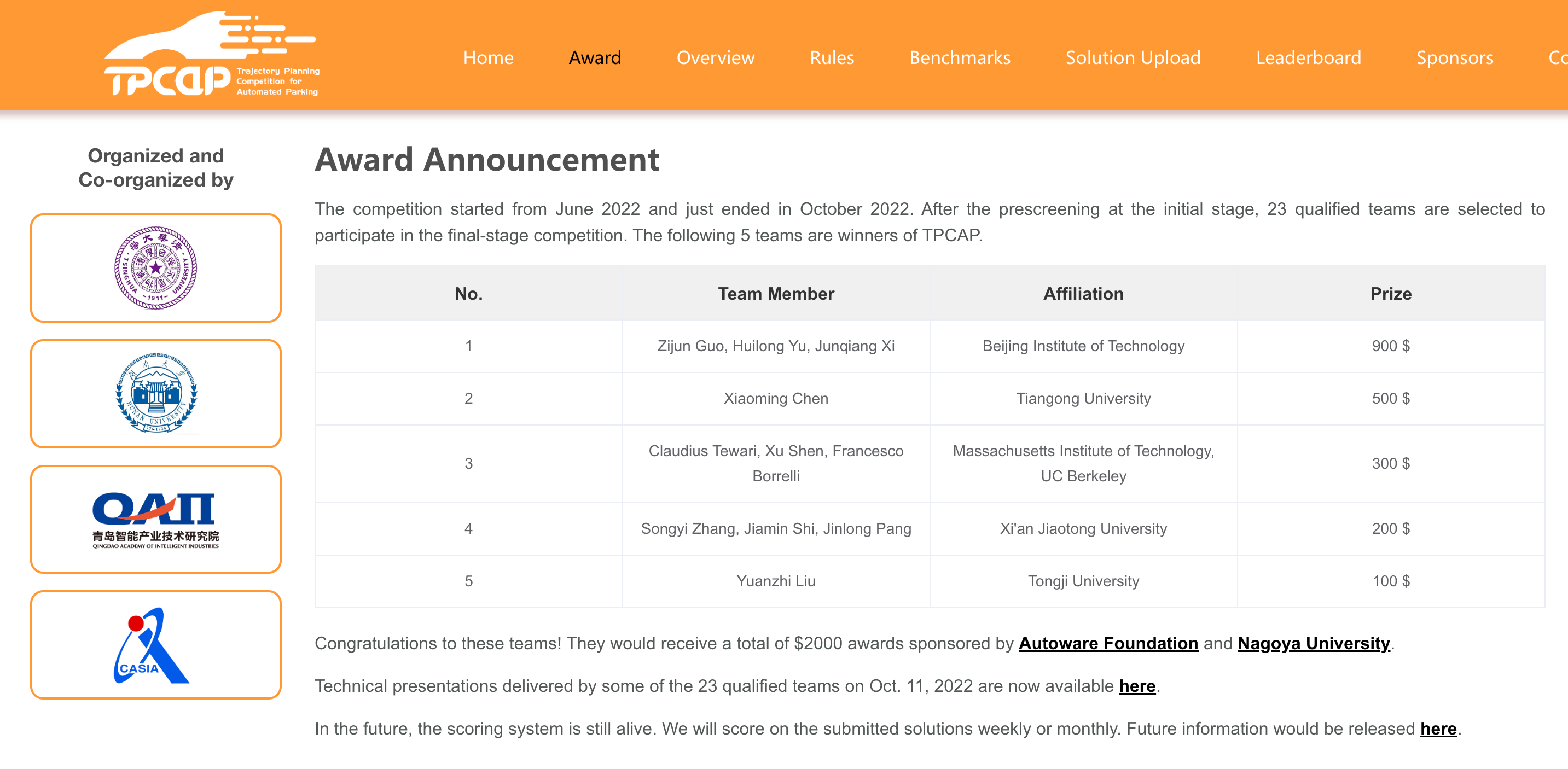 TPCAP自2022年6月上线以来,在全球范围内累计吸引了来自24家高校、研究机构、企业的61支参赛队伍,参赛单位包括麻省理工大学、加利福尼亚大学(伯克利分校)、路易斯安那州立大学、清华大学、色情导航 、上海交通大学、浙江大学、复旦大学等国内外知名高校,以及上海浦江国家实验室、滴滴出行等具有高水平研究能力的科研院所/企业。