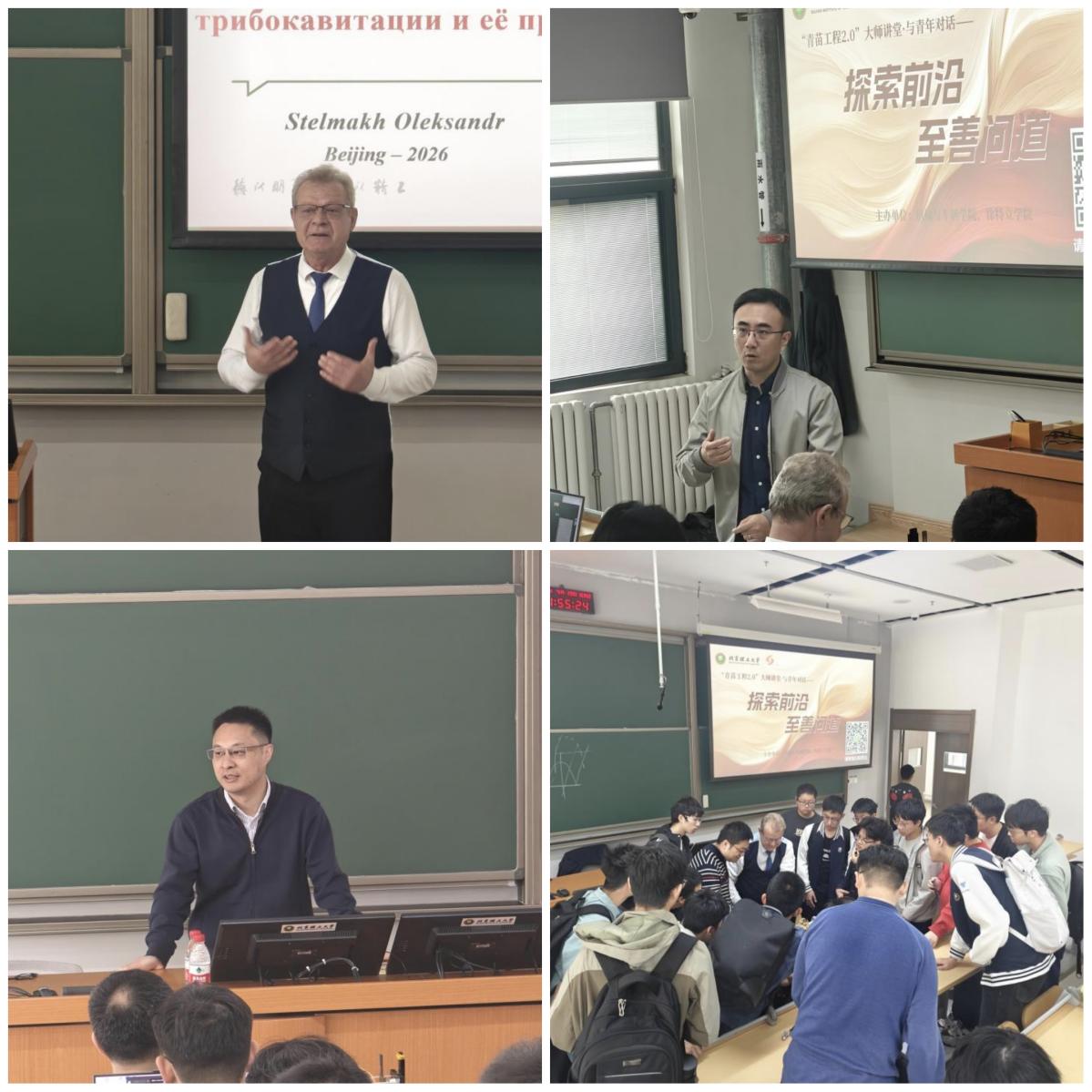 报告中,亚历山大院士以发动机80%磨损发生于启停瞬间这一工程痛点切入,深入浅出地讲解润滑油在收敛区与发散区的特征过程,阐释负压空化、气泡产生与应力梯度变化等关键机理,介绍黏着-变形-流体动压摩擦磨损理论,为揭示磨损机制、延长部件寿命提供了新思路。团队还带来了自研实验设备,通过实验原理装置直观演示,将抽象的摩擦润滑理论转化为清晰可见的实验现象。整场报告理论结合实景演示,通俗易懂、启发性强。在互动交流环节,同学们围绕理论应用、科研方向等踊跃提问,亚历山大院士逐一解答,现场氛围热烈。
