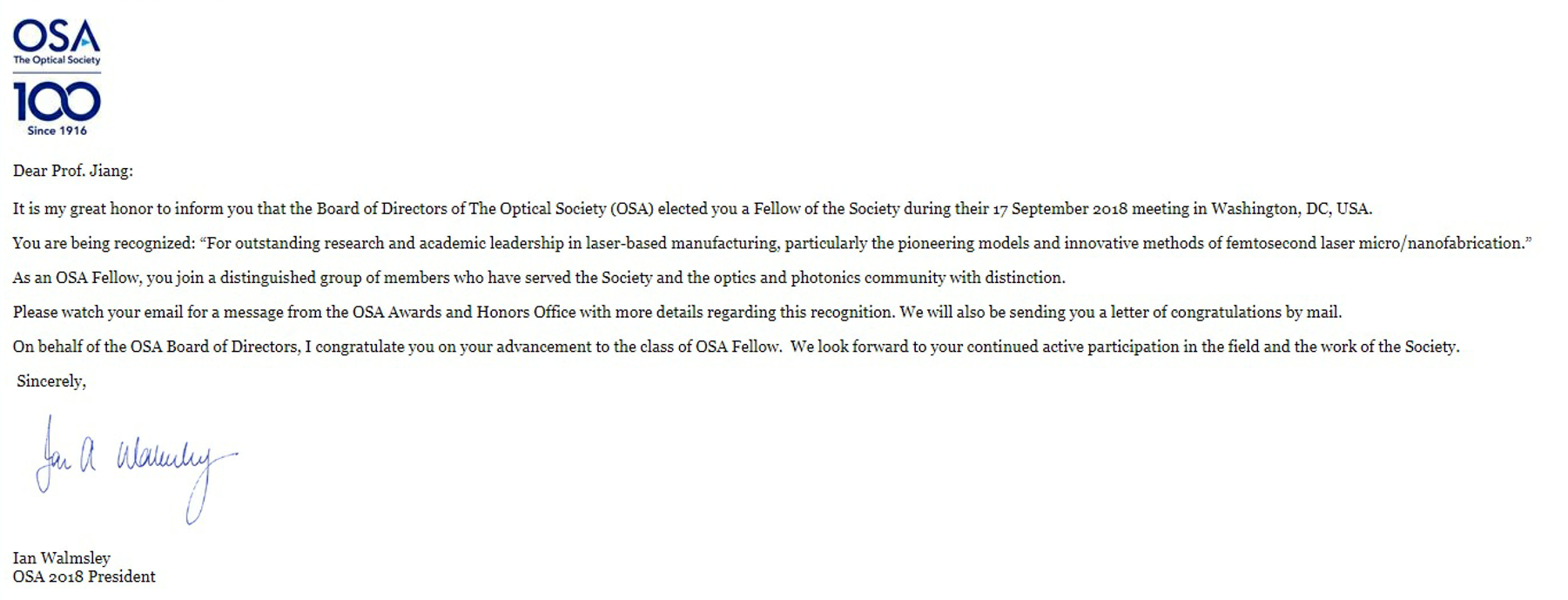 此外,姜澜教授近期当选美国光学学会会士(OSA Fellow)。美国光学学会在姜澜教授当选理由中解释是由于其“在激光制造领域的杰出研究成果和学术领袖地位,特别是飞秒激光微/纳加工的开创性工作。(For outstanding research and aca-demic leadership in laser-based manufacturing, particularly the pioneering work of femtosecond laser micro/nanofabrication.)” 这是继美国机械工程学会会士(ASME Fellow)和国际纳米制造学会会士(ISNM Fellow)之后姜澜教授当选的第三个国际学会会士。