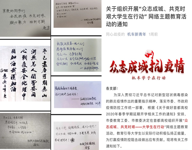 强化思想引领,做实疫情防控思想政治教育宣传工作。学生工作组充分发挥网络育人阵地优势,在思政教育线上平台——“机车新青年”开展疫情防控网络思政教育,发布了《网上见面,亦是思念》《@机车学子,终于到了宅在家里就能对社会做贡献的时刻了!》《同心战疫丨师生相伴字里行间书写暖心话!》《积极心理杂货铺丨在家待着如何不焦躁》《积极心理杂货铺·为你读诗丨武汉,春天了》等疫情防控能量贴和网文,传达关心关爱的同时强化对学生的思想引领,引导广大学生“共防疫、齐配合、听指挥、不返校”,凝心聚力,共克时艰。