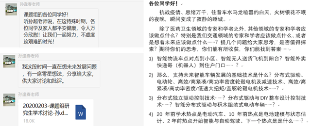 电动车辆国家工程实验室的老师们深知学生们的困惑,第一时间就组织对所有学生本人和家长进行新冠肺炎情况摸底调查。深夜之中,老师们还在思考学生们的研究课题,为学生提供创新的想法;肺炎肆虐,老师们决心从本学科专业出发,为防控疫情提供科技支撑;放眼未来,老师们坚信我们一定可以打赢这场硬仗,而现在必须思考未来的发展方向。同学们深受鼓舞,纵使心生胆怯,看到老师的鼓励也会学会勇敢。每一次讨论都积极踊跃,同学们的反馈既振奋又有趣:“谢谢老师的指导,我认为自动化的物流配送一定会是未来!”,“在家里憋坏了,和老师同学们一起探讨问题才找回了信心!”……疫情当前,北理师生勇担重任,居家隔离战病毒,“闭门造车”创一流!