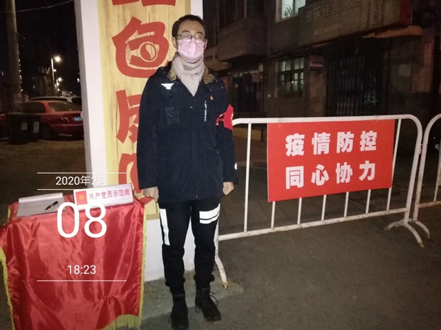 “疫情防控,用心行动;党旗在前,党员向前;疫情不灭,我们不退……”这是2017级本科生党员石坚在日志里写的一段话。近日来,在家乡疫情防控工作一线,石坚同当地社区工作者一起,在东北依旧凛冽的寒风中,站上了“党员示范岗”。他说:“聚是一团火,散是满天星。在这样的特殊时期,党员更要奉献在一线,这是我们应有的使命与担当。”