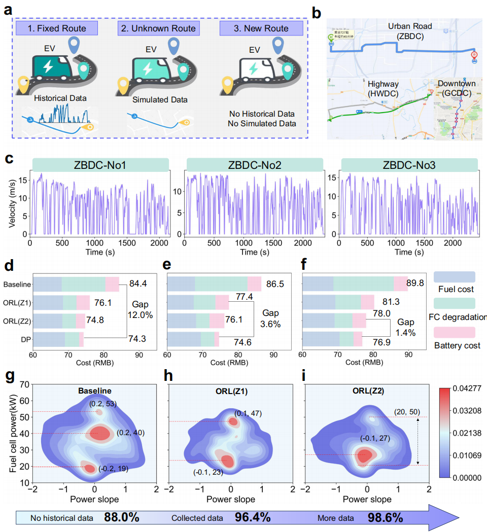 研究团队通过自主研发数据增强的电动汽车数字模型,实现了电动汽车监测与管理系统真实运行数据与仿真模型数据的结合,成功构建了覆盖多种运行工况、包含高维多源数据特征的大规模电动汽车数据集。提出了融合行为克隆与判别器混合正则化项的离线强化学习方法,解决了策略学习中存在的分布偏移问题,既能保持策略学习的有效约束,又能实现性能优化。基于实车运行数据的学习验证,该方法在燃料电池电动汽车上实现了能耗水平和系统寿命的双重提升,并具备持续自我进化能力,仅经过两次数据学习,性能就从初始的88%最优性提升至98.6%。此外,该方法展现出良好的兼容性,能够无缝集成到现有基于规则或其他方法的能量管理系统中。
