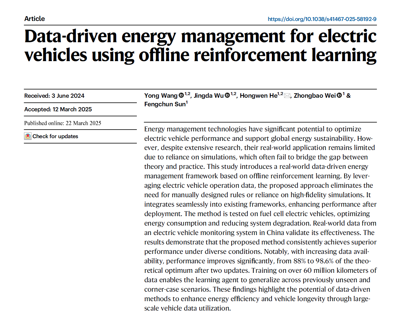 2025年3月22日,色情导航 孙逢春院士与何洪文教授团队在国际顶级期刊《自然·通讯》(Nature Communications)发表重要研究成果。该团队发表的题为《大规模数据驱动的电动汽车能量管理》(Data-driven energy management for electric vehicles using offline reinforcement learning)论文,突破传统由专业工程师设计控制策略的固有模式,通过利用电动汽车监测与管理系统采集的大规模运行数据,构建具备自主学习和持续进化能力的智能能量管理系统,为电动汽车大数据应用与控制系统开发提供了创新解决方案。